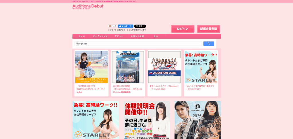 Webマガジン形式で最新オーディション情報を配信するポータルサイト。モデルや俳優系に強いが、近年はアイドル募集の掲載も増加傾向。