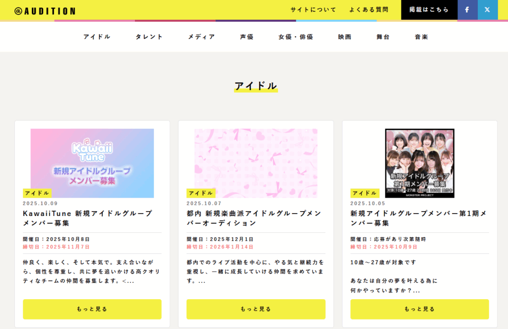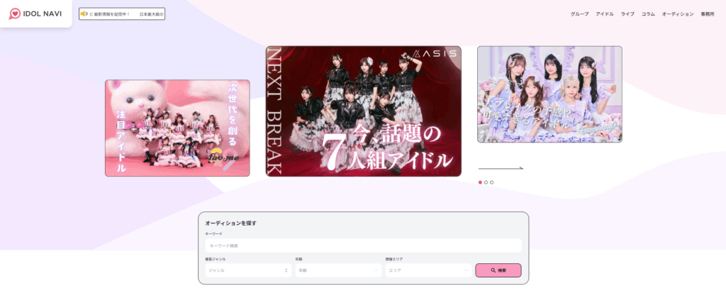 アイドル専門の情報サイトで、オーディションページでは「女性アイドルグループ」を中心に常時20件以上の募集が掲載。