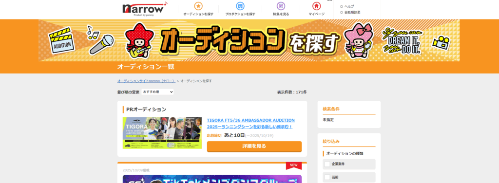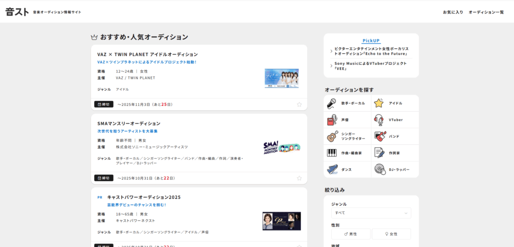 オリコン系列が運営する老舗のオーディション情報サイト。事務所直結の公式募集が多く、ジュニア層・未経験者向けの募集にも強いのが特徴。