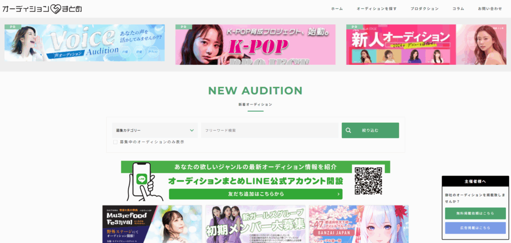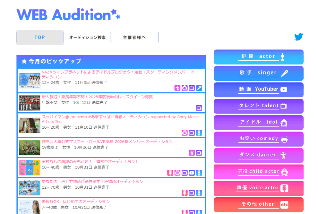 Web Audition | 俳優・モデル系も多い | 簡易な告知形式 | 幅広い層 | 詳細は公式リンク要確認 |