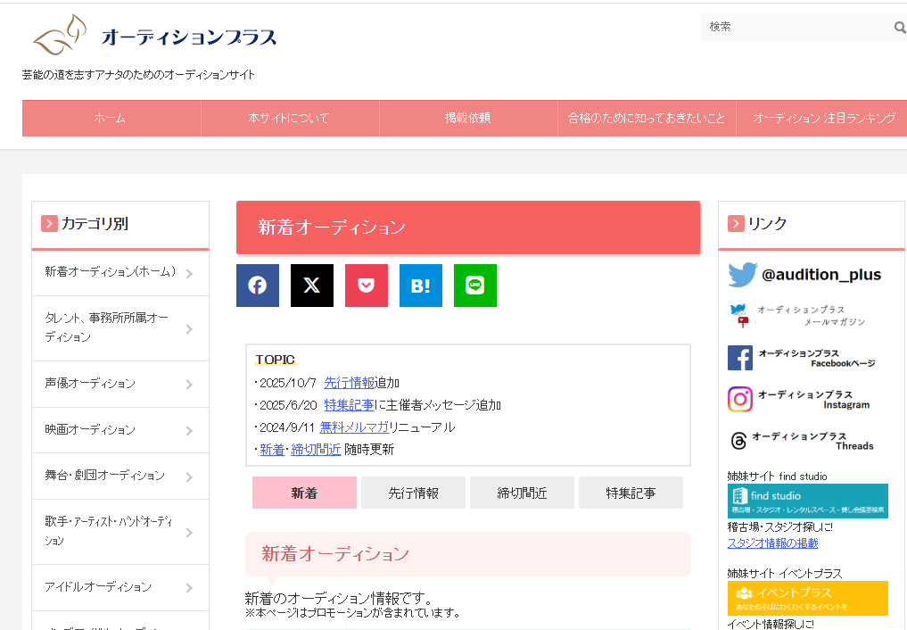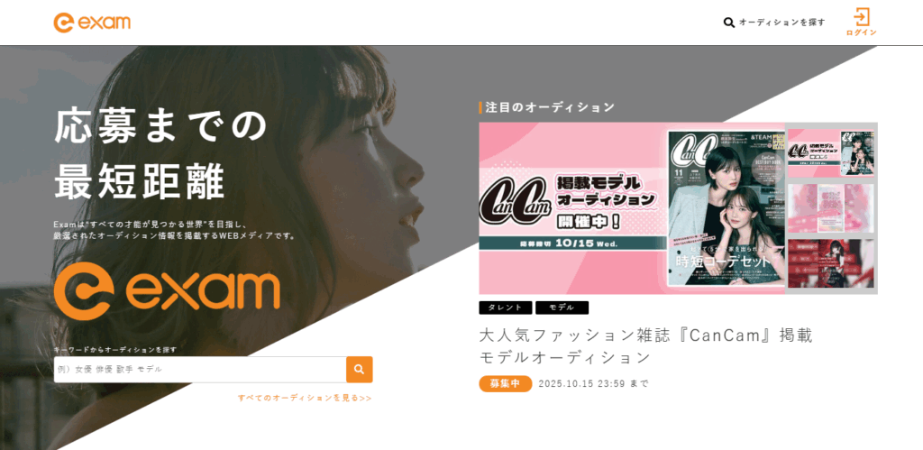 芸能オーディション情報誌「Audition」編集部が運営する定番ポータル。雑誌連動企画が多く、撮影会オーディションや写真投稿型の募集も定期的に掲載。